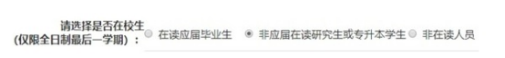 2.“申請地類型”選擇。在戶籍所在地申請認定的選擇“戶籍所在地”,在持有的居住證所在區(qū)縣申請認定的選擇“居住地”;現(xiàn)役軍人和現(xiàn)役武警選擇“居住地”。 注:全日制普通高校非在校最后一學(xué)期的在讀專升本學(xué)生,必須提供??茖W(xué)歷證書;全日制普通高校非在校最后一學(xué)期的在讀研究生,必須提供本科學(xué)歷證書。兩者在報名系統(tǒng)中填寫個人信息時,下圖中選項必須選擇“非應(yīng)屆在讀研究生或?qū)I緦W(xué)生”。